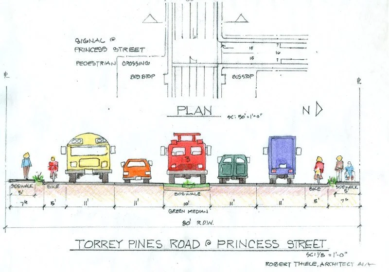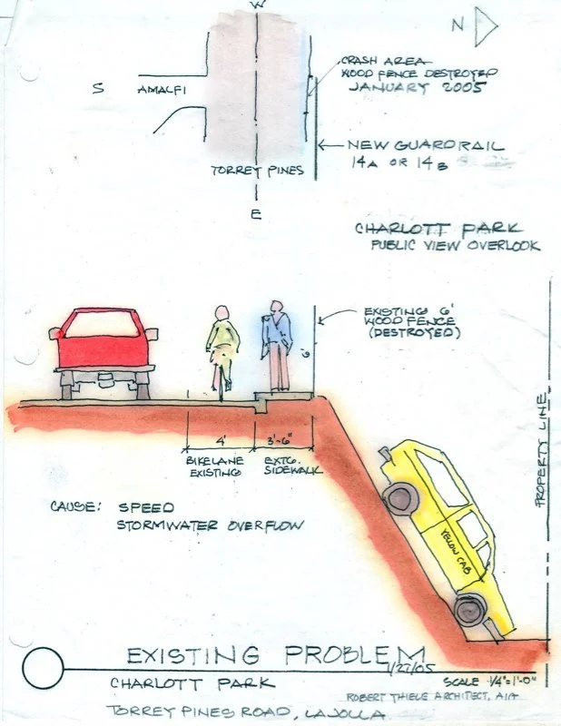 Torrey Pines Road is traveled by 60,000 cars a day in and out of La Jolla. Currently it is dangerious to cross, poorly landscaped with public views hidden. The approved